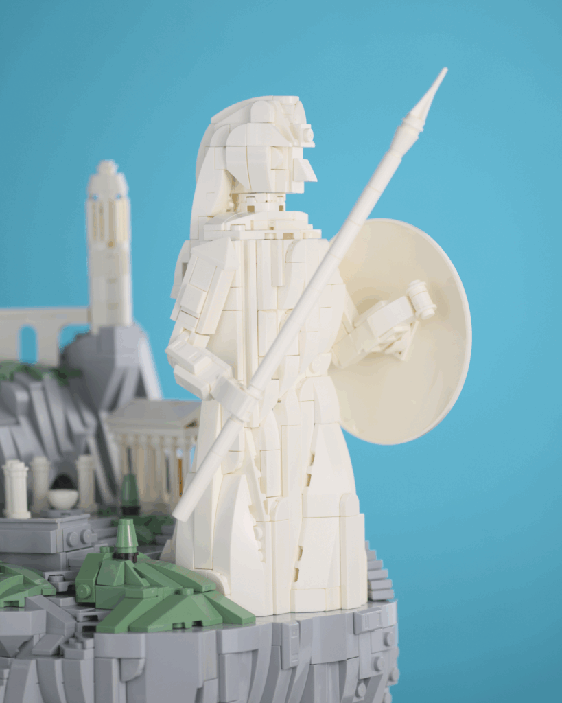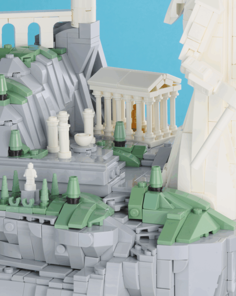 Behind the statue, a temple sheltered a sculpture whose golden glow shimmered in the sunlight. Encircled by marble columns, a sacred bowl seemed meant for ancient rites. Higher still, the cliffs continued to rise, crowned by a lone lighthouse that overlooked the empty drop below.